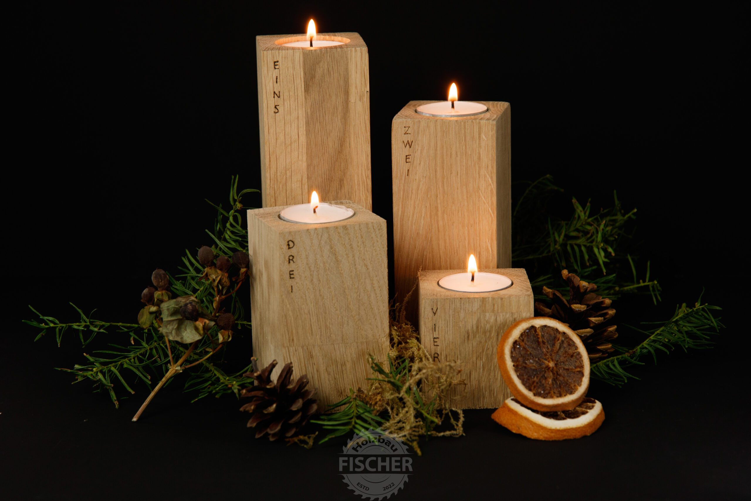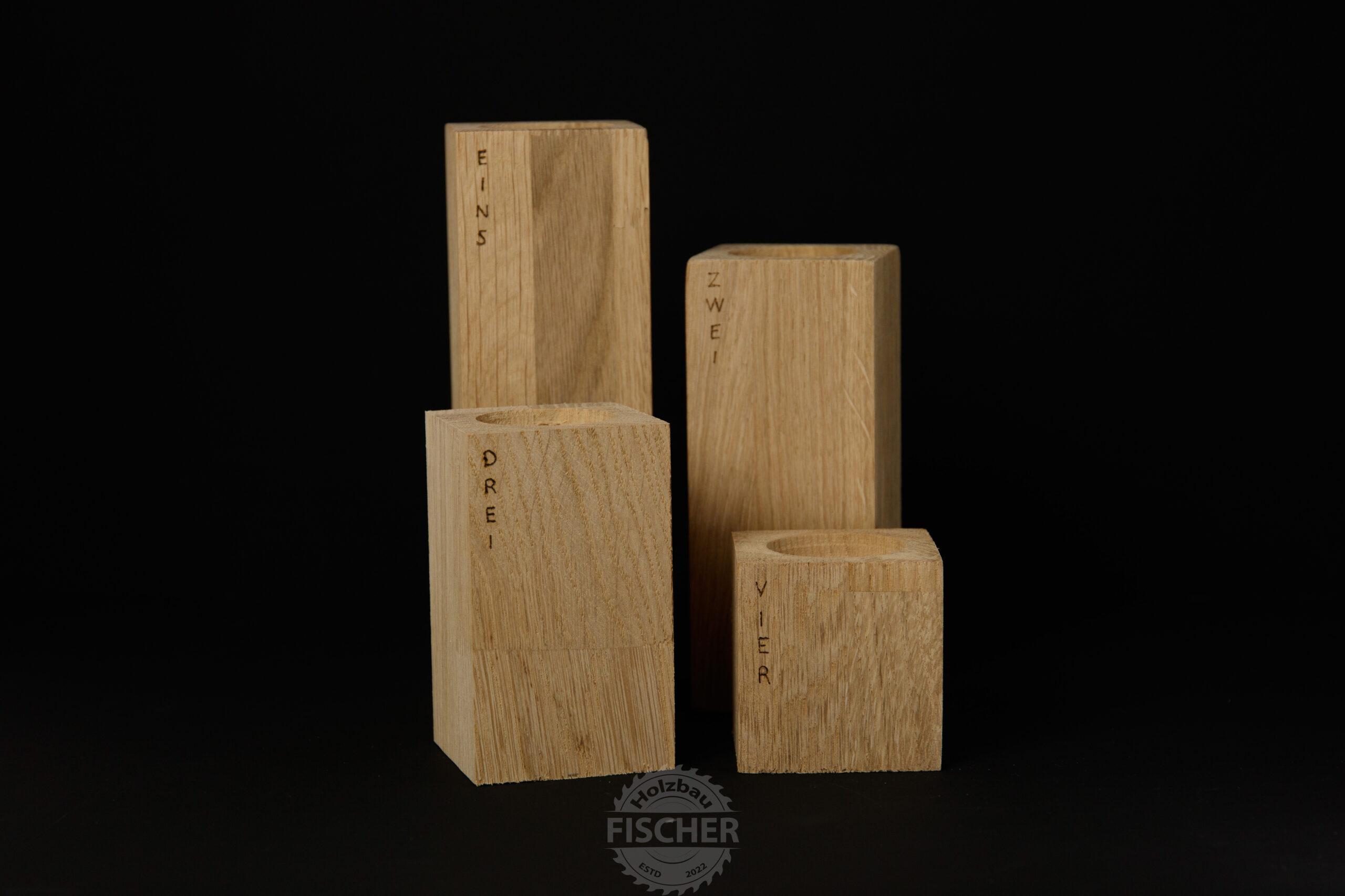 4 Teelichthalter aus Eichenholz in unterschiedlicher Höhe mit eingravierter Adventszahlen-Beschriftung